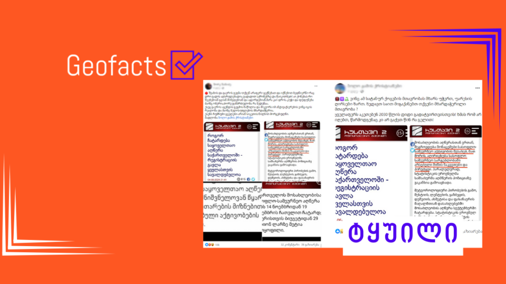სოციალურ ქსელში გავრცელებული ფოტოანაბეჭდები Facebook-მომხმარებლების აღწერებთან ერთად ქმნის წარმოდგენას, თითქოს საყოველთაო აღწერა, გაეროს დაკვეთით, სახელმწიფოს მიერ მოსახლეობისთვის ქონების ჩამორთმევის წინაპირობაა. რეალურად, ღონისძიება საყოველთაო ეკონომიკური, სოციალური და დემოგრაფიული მონაცემების შესაგროვებლად ტარდება.