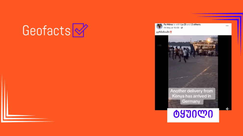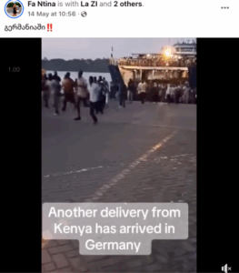 სოციალურ ქსელში Facebook-მომხმარებელი Fa Ntina, რომლის მიერ გავრცელებული დეზინფორმაცია „ჯეოფაქტსს“ წარსულშიც გადაუმოწმებია (1; 2), ავრცელებს ვიდეოს (დაარქივებული ბმული) სათაურით – „გერმანიაში!“. ვიდეოში გემიდან ჩამოსული ათობით ადამიანს ვხედავთ, მისი აღწერა კი – „კენიიდან კიდევ ერთი გზავნილი ჩამოვიდა გერმანიაში“ – მიუთითებს, რომ ვიდეოში ასახულ ადამიანებს ავტორი გერმანიაში ჩასულ მიგრანტებად წარმოაჩენს. სინამდვილეში, ვიდეო ძველია და არა გერმანიაში, არამედ კენიაშია გადაღებული.
