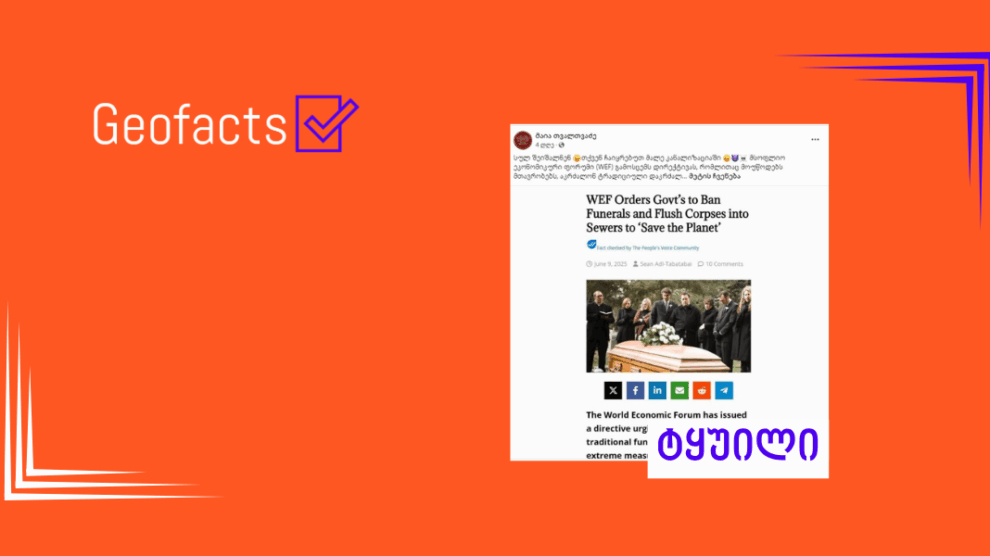 სოციალურ ქსელში Facebook-მომხმარებელი მაია თვალთვაძე, რომლის მიერ გავრცელებული დეზინფორმაცია (1, 2, 3, 4, 5) „ჯეოფაქტსს“ წარსულშიც გადაუმოწმებია, აქვეყნებს პოსტს აღწერით (დაარქივებული ბმული): „მსოფლიო ეკონომიკური ფორუმი (WEF) გამოსცემს დირექტივას, რომლითაც მოუწოდებს მთავრობებს, აკრძალონ ტრადიციული დაკრძალვები და მიიღონ უკიდურესი ზომები, როგორიცაა გვამების კანალიზაციაში ჩაყრა „პლანეტის გადასარჩენად“, როგორც მისი 2030 წლის დღის წესრიგის ნაწილი“. რეალურად, მსოფლიო ეკონომიკურ ფორუმს მსგავსი დირექტივა ან გეგმა არ მიუღია. აღნიშნული ამბის გავრცელება გამოცემა The People’s Voice-ს უკავშირდება, წყაროს, რომელსაც მცდარი ინფორმაცია აქამდეც არაერთხელ გაუვრცელებია.