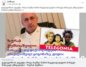 სოციალურ ქსელში ვრცელდება სამედიცინო შინაარსის სტატია, რომელშიც განხილულია ტელეგონიის თეორია. სტატიაში გამოთქმულია მტკიცებები, რომ თითქოს „მეცნიერულად დადასტურებულია, რომ იმ გოგონას გენეტიკური აპარატი, რომელსაც სქესობრივი კავშირი ჰქონდა ბევრ პარტნიორთან, იღებს ინფორმაციას ყველა მასთან ნამყოფი მამაკაცისგან“; „ქალის მემკვიდრეობითობაზე ზემოქმედებას ახდენენ მისი ყველა ადრინდელი სექსუალური პარტნიორები, განსაკუთრებით – მისი პირველი მამაკაცი. ბავშვს მამაკაცისგან სხვადასხვა ნიშან-თვისებები გადაეცემა: პირველ შემთხვევაში ხდება ბევრი ნიშან-თვისების გადაცემა, რაც რჩება ქალის ორგანიზმში“. სინამდვილეში, ტელეგონია ფსევდომეცნიერებაა და ქალის მემკვიდრეობითობაზე გავლენას მხოლოდ დედისა და მამის ორგანიზმის ნიშან-თვისებები ახდენს.