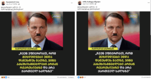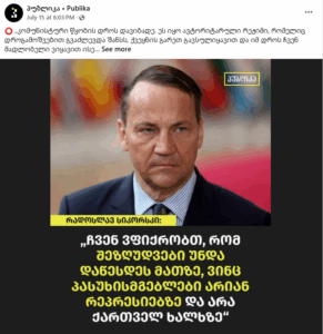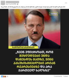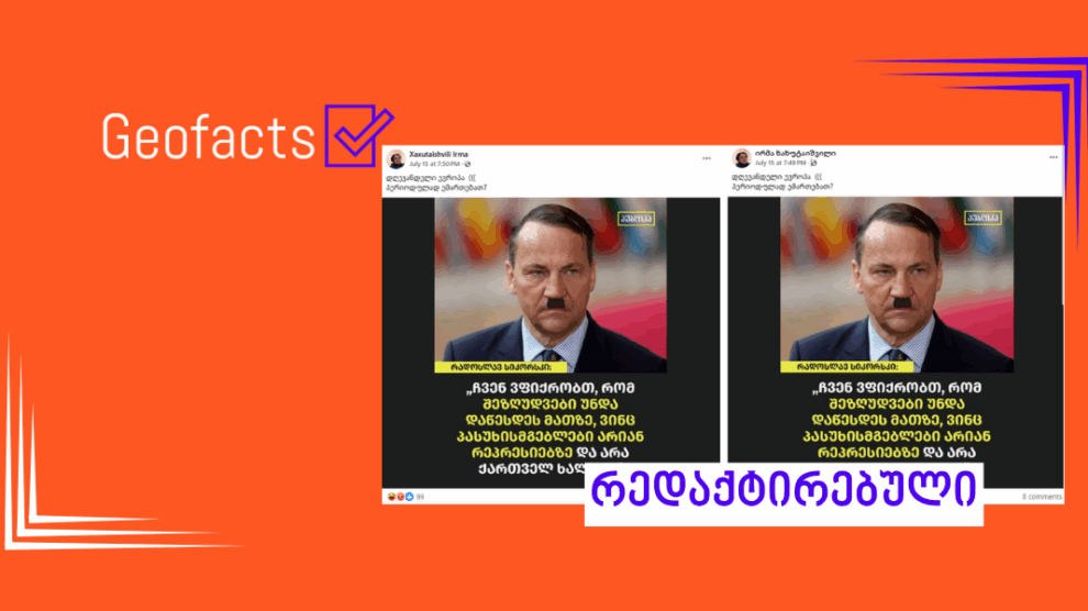 სოციალური ქსელის მომხმარებელმა ირმა ხახუტაიშვილმა, რომლის მიერ გავრცელებული დეზინფორმაციული პოსტები „ჯეოფაქტსს“ აქამდეც გადაუმოწმებია (ბმული 1, 2), 2025 წლის 15 ივლისს გამოაქვეყნა ონლაინ მედია „პუბლიკას“ საინფორმაციო ბარათი, რომელზეც დატანილია პოლონეთის საგარეო საქმეთა მინისტრის, რადოსლავ სიკორსკის, ციტატა „ჩვენ ვფიქრობთ, რომ შეზღუდვები უნდა დაწესდეს მათზე, ვინც პასუხისმგებელნი არიან რეპრესიებზე და არა ქართველ ხალხზე“ (იხილეთ ბმული 2). ფოტოზე რადოსლავ სიკორსკის გამოსახულება ჰიტლერის მსგავსი ულვაშითაა მოცემული.