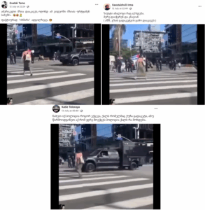 სოციალურ ქსელში ვირუსულად ვრცელდება ვიდეო (ბმული 1, 2, 3, 4, 5) (დაარქივებული ბმული), რომელშიც აშშ-ში პოლიციელსა და დემონსტრანტ ქალს შორის კონფრონტაციისა და მისი დაკავების კადრებია ასახული. სოციალური ქსელის მომხმარებლები ვიდეოს საქართველოში მიმდინარე პროტესტის პროცესებს უკავშირებენ და აღწერებში ვხვდებით შემდეგ ფრაზებს: „ზუსტი ანალოგი რაც აქ ხდება. მერე დაიჭერენ და კნავიან (აშშ, გზას გადაკეტვის გამო დააკავე)“; „ნახეთ იქ პოლიცია როგორ ექცევა, ქალს რომელმაც ქუჩა გადაკეტა, ანუ წარმოიდგინეთ აქ რომ ეგრე მოექცეს პოლიცია ქალს რა მოხდება“; „ამერიკული “ძერმოკრატია”“; „ამერიკელი მზია დააკავეს, ოღონდ ამ ვიდეოში მზიას ურტყამენ სახეში“. სინამდვილეში, ვიდეოში ასახული ქალი არა ქუჩის გადაკეტვის მცდელობის, არამედ პრეზიდენტ ჯო ბაიდენის ავტოკოლონისთვის ხელის შეშლის მიზეზით დააკავეს.