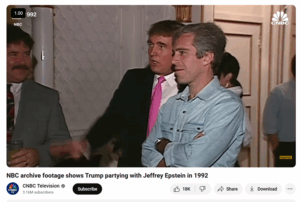 სოციალურ ქსელში ვრცელდება ვიდეო, რომელშიც აშშ-ის პრეზიდენტი დონალდ ტრამპი და  ფინანსისტი ჯეფრი ეპშტეინი ბავშვებთან ერთად ჩანან, რომლებზეც ტრამპი ეპშტეინს თითით ანიშნებს. ვიდეოს აღწერა შემდეგია: „ვიდეოკადრები NBC-ის არქივიდან, გადაღებული 1992 წელს – ვიდეოში ჩანან დონალდ ტრამპი და ჯეფრი ეფშტეინი, მარ-ა-ლაგოს წვეულებაზე.