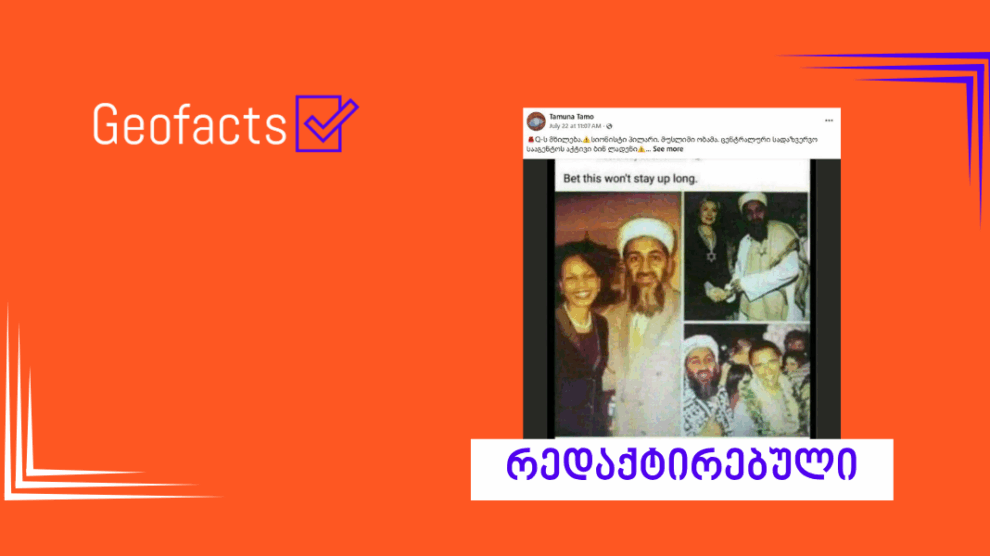 სოციალურ ქსელში ანგარიში „Tamuna Tamo”, რომლის გავრცელებული დეზინფორმაცია „ჯეოფაქტს“ აქამდეც გადაუმოწმებია, აშშ-ის ყოფილი პრეზიდენტის ბარაკ ობამას, ყოფილი სახელმწიფო მდივნის კონდოლიზა რაისისა და ჰილარი კლინტონის „ალ-კაიდას“ ლიდერ ოსამა ბინ ლადენთან გადაღებულ ფოტოებს ავრცელებს (დაარქივებული ბმული). რეალურად, აღნიშნული ფოტოები ყალბია და პროგრამულად არის დამუშავებული.