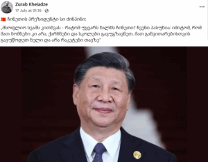 სოციალურ ქსელში Facebook-მომხმარებელი ავრცელებს პოსტს, რომელშიც გამოტანილია ჩინეთის ლიდერის, სი ძინპინის სავარაუდო ციტატა: „მსოფლიო სვამს კითხვას – რატომ უყვარს ხალხს ჩინეთი? ჩვენი პასუხია: იმიტომ, რომ მათ ბომბები კი არა, ქარხნები და სკოლები გავუგზავნეთ. მათ განვითარებისთვის გავუწოდეთ ხელი და არა რაკეტები თავზე”. სინამდვილეში, ციტატა ყალბია და მის ნამდვილობას არც ერთი სანდო წყარო არ ადასტურებს.