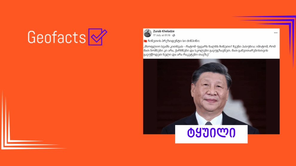 ამის საპირისპიროდ კი, ჩინეთის პრეზიდენტის მსგავსი ციტატა არ გვხვდება ჩინეთის მთავრობასთან აფილირებულ მედია-საშუალებებში (Xinhua News Agency, People’s Daily, CGTN). ამდენად, გავრცელებული ციტატის ნამდვილობა არ დასტურდება.