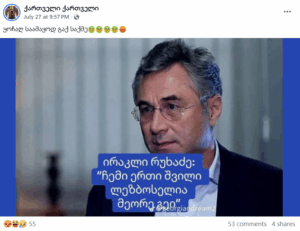 სოციალურ ქსელში გავრცელდა ირაკლი რუხაძის ფოტო. ფოტოზე დატანილია ციტატა, რომელსაც ტელეკომპანია „იმედის“ მფლობელს მიაწერენ: „ჩემი ერთი შვილი ლესბოსელია, მეორე – გეი“.