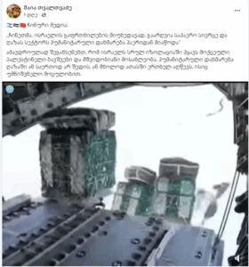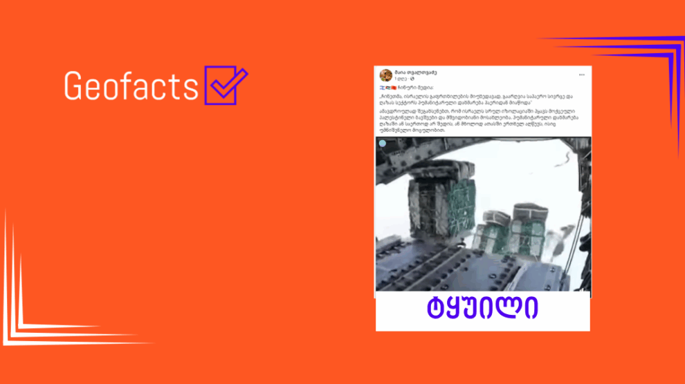 სოციალურ ქსელში Facebook-მომხმარებელი მაია თვალთვაძე, რომლის მიერ გავრცელებული დეზინფორმაცია (1, 2, 3, 4, 5) „ჯეოფაქტსს“ წარსულშიც გადაუმოწმებია, ვიდეოს (დაარქივებული ბმული) აქვეყნებს, აღწერაში კი წერს: „ჩინეთმა, ისრაელის გაფრთხილების მიუხედავად, გაარღვია საჰაერო სივრცე და ღაზას სექტორს ჰუმანიტარული დახმარება ჰაერიდან მიაწოდა”. რეალურად, ვიდეოში, რომელიც 2024 წლით თარიღდება, არა ჩინეთის, არამედ 9 ქვეყნის, მათ შორის, აშშ-ის, საფრანგეთისა და დიდი ბრიტანეთის მიერ ღაზასთვის ჰუმანიტარული დახმარების მიწოდება ჩანს. მიმდინარე წლის მარტიდან, მას შემდეგ, რაც ისრაელმა ღაზას სრული ბლოკადა გამოაცხადა, ინფორმაცია იმის შესახებ, რომ ჩინეთმა ეს ბლოკადა დაარღვია, არ დასტურდება.