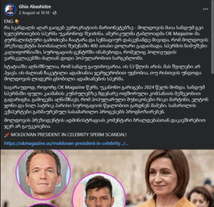 სოციალურ ქსელში როგორც ქართულენოვანი (1; 2; 3; 4), ასევე რუსულენოვანი ანგარიშები (1; 2; 3) და კრემლისტური მედია (Российская газета, Царьград, news.ru) ავრცელებენ ინფორმაციას, თითქოს მოლდოვის პრეზიდენტმა მაია სანდუმ „გეი სელებრითების სპერმა უკანონოდ შეიძინა“. გამავრცელებლებს ინფორმაციის წყაროდ და დამადასტურებლად ამერიკული ტაბლოიდი OK Magazine-ი მოჰყავთ, რომელმაც, მათი მტკიცებით, აღნიშნულ საკითზე ჟურნალისტური გამოძიება ჩაატარა. ქართულენოვან პოსტებში დამატებით ვკითხულობთ, რომ „მოლდოვის პრეზიდენტმა ბიომასალის შეძენაში 400 ათასი დოლარი გადაიხადა. სპერმის ნიმუშები კალიფორნიაში, სუროგაციის ცენტრში ინახებოდა, რომელიც ჰოლივუდის ვარსკვლავებში ძალიან დიდი პოპულარობით სარგებლობს.“ სინამდვილეში, გავრცელებული ინფორმაცია ყალბია.