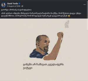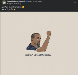 ნახატის ავტორი თამუნია ბუდაღაშვილია, რომელიც ქვეყანაში მიმდინარე მოვლენებთან დაკავშირებით ჩანახატებს ხშირად აქვეყნებს (იხ. ფოტოები ქვემოთ).