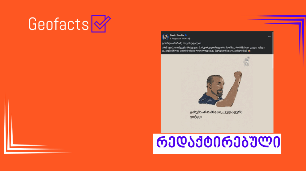 სოციალურ ქსელში Facebook-მომხმარებელი David Tordia, რომლის მიერ გავრცელებული დეზინფორმაცია „ჯეოფაქტსს“ წარსულშიც გადაუმოწმებია (1, 2, 3), ფოტოს ავრცელებს, რომელზეც ექიმი გიორგი ახობაძის ილუსტრაციაა გამოსახული. ფოტოზე დატანილია წარწერა: „ციხეში არ ჩამსვათ, ყველაფერს ვიტყვი“. ფოტოს მარჯვენა ზედა კუთხეში ტელეკომპანია „ფორმულას“ ლოგო ჩანს. გამოქვეყნებულ ფოტოს Facebook-მომხმარებელი შემდეგნაირად ასათაურებს: „ამან ალბათ იმდენი მსხვილი ნარკორეალიზატორი ჩაუშვა, წესით დაცვა უნდა დავუნიშნოთ, თორე რამე რომ მოუვიდეს მერე ჩვენ დაგვაბრალებენ“. სინამდვილეში, აღნიშნული აღწერა გიორგი ახობაძის საქმის შესახებ შეცდომაში შემყვანია, ხოლო თანდართული ფოტო რედაქტირებული.