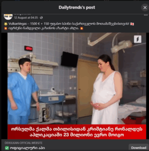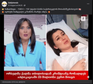სოციალურ ქსელში ვრცელდება ვიდეო, რომელშიც საზოგადოებრივი მაუწყებლის წამყვანი მარიამ ვაშაძე შემდეგ ინფორმაციას აცხადებს: „სენსაციური ისტორია. თბილისის სამშობიაროდან მთელი ქვეყანა შეძრა, ქალმა ერთ ღამეში შვილი გააჩინა და 23 მილიონი ევრო მოიგო. ნინო ბერიძე გახდა ყველაზე მდიდარი მშობიარე საქართველოში, კრიშტიანუ რონალდუს მიერ შექმნილი აპლიკაცია „ლაქი ჩიკის“ წყალობით…”. ვიდეოს თან ახლავს მაუწყებლის ლოგოც და მის ქვედა ნაწილში განთავსებულ ტექსტში აღნიშნულია „ორსულმა ქალმა თბილისიდან კრიშტიანუ რონალდუს აპლიკაციაში 23 მილიონი ევრო მოიგო“. სინამდვილეში ვიდეო ნამდვილი არ არის და ის ხელოვნური ინტელექტითაა გენერირებული.