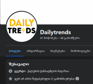 ვიდეო Facebook-ზე გვერდმა, სახელად Dailytrends განათავსა. გვერდზე გადასვლისას ჩანს, რომ მათ პოსტები გამოქვეყნებული არ აქვთ. ზემოაღნიშნული ვიდეო მათ Facebook-ის რეკლამების ბიბლიოთეკაში 4-ჯერ აქვთ დასპონსორებული. გვერდის აღწერაში აღნიშნულია, რომ ის ქალების ტანსაცმლის მაღაზიაა, თუმცა გვერდის მიერ მითითებული კატეგორია არ ემთხვევა რეკლამების ბიბლიოთეკაში განთავსებული პოსტების შინაარსს. აღსანიშნავია ისიც, რომ დარეკლამებული პოსტები მათ გვერდზე (ე.წ. Timeline-ზე) არ გვხვდება.