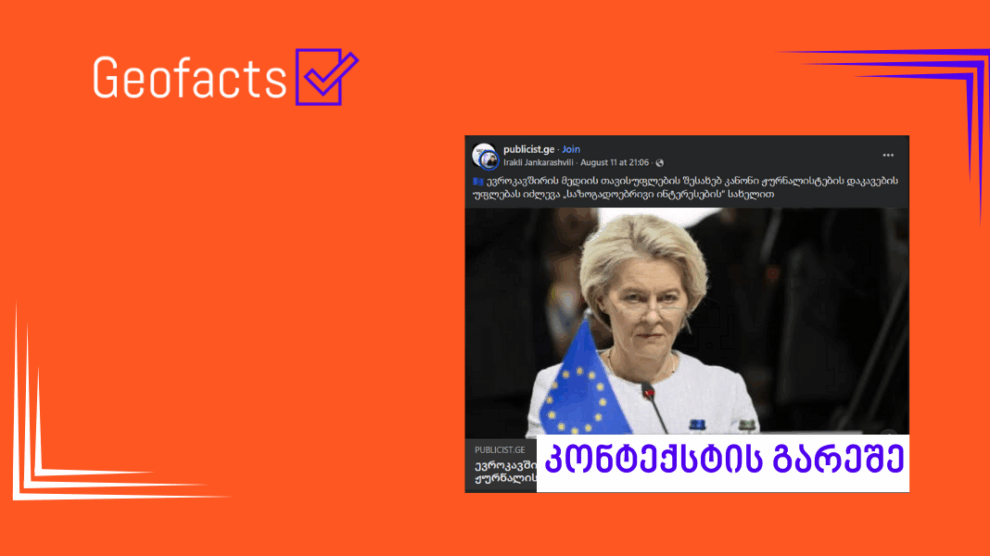 სოციალურ ქსელში გამოცემა publicist.ge ავრცელებს სტატიას, რომელშიც ვკითხულობთ: „ევროკავშირის მედიის თავისუფლების შესახებ კანონი ჟურნალისტების დაკავების უფლებას იძლევა „საზოგადოებრივი ინტერესების“ სახელით. პირობითი თავისუფლება: ახალი ევროპული მედიის თავისუფლების შესახებ კანონი, რომელიც ძალაში შევიდა ევროკავშირის ყველა სახელმწიფოში, აცხადებს, რომ იცავს პრესის თავისუფლებას, მაგრამ მე-3(ბ) და მე-4(გ) მუხლები ჟურნალისტების დაკავების, სანქციების დაწესების და თვალთვალის უფლებას იძლევა, თუ ეს გამართლებულია „საზოგადოებრივი ინტერესის გადაუდებელი მიზეზით“.