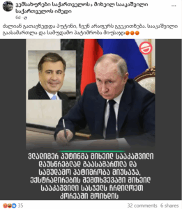 13 აგვისტოს სოციალურ ქსელში Facebook-ანგარიშმა „ვემსახურები საქართველოს“ 2 საინფორმაციო ბარათი გაავრცელა. ერთ-ერთზე გამოსახულია რუსეთის პრეზიდენტი ვლადიმერ პუტინი და საქართველოს მე-3 პრეზიდენტი მიხეილ სააკაშვილი. ფოტოზე დატანილია წარწერა: „ვლადიმერ პუტინმა მიხეილ სააკაშვილი დაუსწრებლად გაასამართლა და სამუდამო პატიმრობა მიუსაჯა, ექსტრადირების შემთხვევაში მიხეილ სააკაშვილი ჩრდილოეთ კორეაში „მოიხდის“.