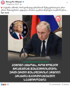 სავარაუდოდ, „ვემსახურები საქართველოს“ ანგარიშმა პუტინის მიერ სააკაშვილის გასამართლების ქარდისთვის გააყალბა „მთავარი არხის“ 7 აგვისტოს გამოქვეყნებული საინფორმაციო ბარათი, რომელზეც ვლადიმერ პუტინი და დონალდ ტრამპი ჩანან. როგორც ჩანს, რედაქტირებისას გვერდმა ტრამპის ფოტო ჩაანაცვლა სააკაშვილის ფოტოთი და მასზე თანდართული ტექსტი შეიცვალა. ორიგინალ პოსტში შემდეგი ტექსტია მოცემული: „პუტინი ამბობს, რომ დონალდ ტრამპთან შეხვედრისთვის ერთ-ერთი შესაფერისი ადგილი არაბთა გაერთიანებული საამიროებია“.
