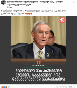 მეორე ფოტოზე კი ჩანს ამერიკელი კონგრესმენი ჯო უილსონი, რომელსაც მიწერილი აქვს შემდეგი ციტატა: „მადლობელი ვარ პრეზიდენტ პუტინის, სააკაშვილი, რომ დამსახურებულად გაასამართლა“. გამავრცელებელი ანგარიში პოსტს ასევე ურთავს საკუთარ კომენტარს: „ნ*******ი უილსონი, ტ***იდან დაბადებული, სააკაშვილის გასამართლება უხარია“.