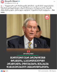მეორე პოსტში კონგრესმენი აღნიშნავს: „მადლიერი ვარ ტრამპის ადამიანის უფლებების შესახებ დამაჯერებელი ანგარიშისთვის, რომელიც ხაზს უსვამს ანტი-ამერიკული „ქართული ოცნების“ რეჟიმის მიერ სიტყვისა და გაერთიანების თავისუფლების, განსაკუთრებით ამერიკასთან მიმართებით ჩახშობას. „მეგობარი აქტი“ გვჭირდება სასწრაფოდ“.