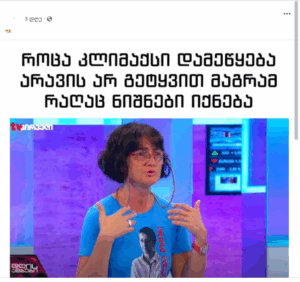 სოციალურ ქსელში Facebook-ანგარიში ჟურნალისტ ნინია კაკაბაძის ფოტოს ავრცელებს და მას შემდეგ ციტატას მიაწერს (არქივირებული ბმული): „როცა კლიმაქსი დამეწყება, არავის არ გეტყვით, მაგრამ რაღაც ნიშნები იქნება“. სინამდვილეში, ციტატა ყალბია, მსგავსი შინაარსის განცხადება ჟურნალისტს არ გაუკეთებია.