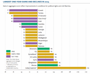 Freedom House-ის წლების სტატისტიკა მკაფიოდ წარმოაჩენს, რომ 2017-2024 წლებში საქართველოს მაჩვენებლები უწყვეტ რეგრესს განიცდის. 2025 წელს, საქართველო ქუვეითთან, ტუნისთან, ელ სალვადორთან, ღაზის სექტორთან და სხვა ტერიტორიებთან ერთად – 3 ქულით 2024 წელს ყველაზე დიდი ქულობრივი ვარდნის მაჩვენებელი ქვეყნების/ტერიტორიების სიაში მოხვდა.