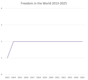 „Freedom House“ გავლენიანი ამერიკული არასამთავრობო ორგანიზაციაა, რომელიც თავისუფლების კუთხით ქვეყნებს ყოველწლიურად, ორი კატეგორიით – პოლიტიკური და სამოქალაქო უფლებების მიხედვით, 100-ქულიანი სკალით აფასებს, სადაც 100 ქულა საუკეთესო შედეგია. შეფასებაში პოლიტიკურ უფლებებს 40, სამოქალაქო უფლებებს კი 60 ქულა ენიჭება.
