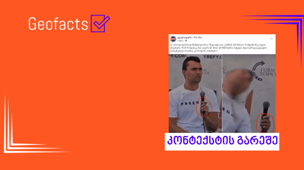 სოციალურ ქსელში Facebook-ანგარიში ცნობილი კონსერვატორი აქტივისტის, ჩარლი კირკის, ფოტოებს ავრცელებს (დაარქივებული ბმული). მარცხენა ფოტოზე კირკს ბეჭედი -არათითზე, ხოლო მარჯვენა ფოტოზე ნეკა თითზე უკეთია. Facebook-ანგარიში: „ეს აბსოლუტურად შეშლილობაა! შეგიძლიათ, ვინმემ ამიხსნას? რამდენიმე ვიდეო აჩვენებს, რომ როდესაც მას ესვრიან, მისი ქორწინების ბეჭედი მყისიერად გადადის საჩვენებელ თითზე [როგორც ჩანს, ანგარიში გულისხმობს ნეკა თითს]. ეს როგორ აიხსნება?“. პოსტი მომხმარებელს უქმნის შთაბეჭდილებას, რომ კირკის მკვლელობის კადრები დამონტაჟებულია.