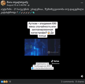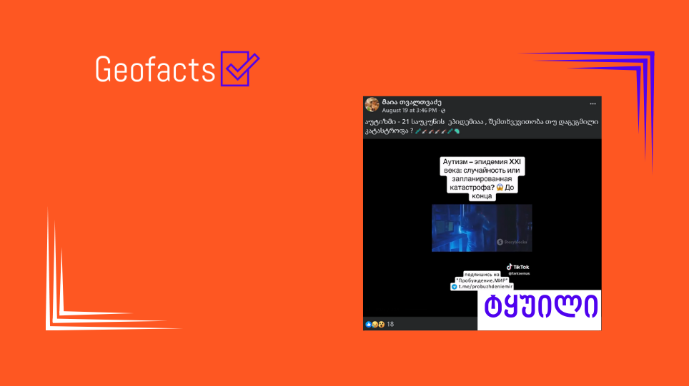 სოციალურ ქსელში Facebook-ანგარიში „მაია თვალთვაძე“, რომლის მიერ გავრცელებული დეზინფორმაცია „ჯეოფაქტსს“ წარსულშიც გადაუმოწმებია (1, 2, 3, 4, 5,6), რუსულენოვან ვიდეოს შემდეგი წარწერით ავრცელებს (არქივირებული ბმული): „აუტიზმი – 21 საუკუნის ეპიდემიაა, შემთხვევითობა თუ დაგეგმილი კატასტროფა?“. ვიდეოში გვხვდება მტკიცება, თითქოს ვაქცინები აუტიზმს იწვევს. სინამდვილეში, მტკიცება, რომ აუტიზმი ხელოვნურად „დაგეგმილი კატასტროფაა“ და რომ ვაქცინებს აუტისტური სპექტრის აშლილობის გამოწვევა შეუძლია, კონსპირაციაა და სანდო წყაროებითა და სამედიცინო კვლევებით არ დასტურდება.