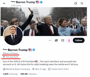საგულისხმოა, რომ პოსტი ბარონ ტრამპს არ ეკუთვნის. ანგარიშს, რომელმაც პოსტი X-ზე გამოაქვეყნა „ⁿᵉʷˢ Barron Trump“ ჰქვია და X-ისგან მას Fan account-ის (მხარდამჭერის მიერ შექმნილი ანგარიში) ნიშანი აქვს მინიჭებული. ანგარიშის აღწერაშიც წერია, რომ ფანების გვერდია და ბარონ ტრამპთან დაკავშირებულ სიახლეებს ავრცელებს.