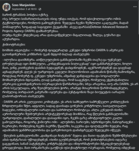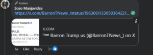 Facaebook-ის მომხმარებელი Soso Manjavidze სოციალურ ქსელში აქვეყნებს პოსტს, რომელშიც მიუთითებს, რომ აღნიშნული ტექსტი აშშ-ის პრეზიდენტის, დონალდ ტრამპის, ვაჟს, ბარონ ტრამპს ეკუთვნის და ბარონმა ის X-ზე გამოაქვეყნა. პოსტში წერია: „ბარონ ტრამპის პოსტია იქსზე, ისე, სრული სიმართლისათვის ისიც უნდა ითქვას, რომ ფსიქოლოგიური ომის ტექნოლოგიები, რომლის გამოყენების შედეგია ჩვენი შეშლილი აკაცუკები, მადამ პომპადური, ზოგადად საგიჟეთი ქვეყანაში ასევე დარპას (Defense Advanced Research Projects Agency-DARPA) დამსახურებაა. თუმცა ჩვენი ენდემიკაც არაა დასავიწყებელი-მაგალითად, შალვა, გუბაზი და აქუბარდია….“. (არქივირებული ბმული)