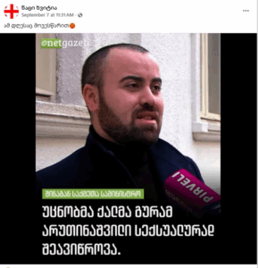 სოციალურ ქსელში ვრცელდება პოსტები (1, 2) (არქივირებული ბმული), რომელშიც ჟურნალისტ გურამ არუთინაშვილის შესახებ „ნეტგაზეთის“ საინფორმაციო ბარათი შემდეგი სათაურით არის გამოტანილი: „უცნობმა ქალმა გურამ არუთინაშვილი სექსუალურად შეავიწროვა“. სინამდვილეში, ნეტგაზეთს მსგავსი ინფორმაცია არ გამოუქვეყნებია და პოსტის ორიგინალი სატირული მიზნით შეიქმნა.