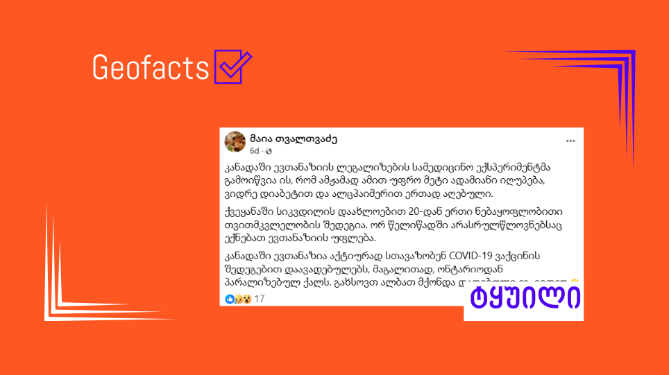 სოციალურ ქსელში Facebook-ანგარიში „მაია თვალთვაძე“, რომლის მიერ გავრცელებული დეზინფორმაცია „ჯეოფაქტსს“ წარსულშიც გადაუმოწმებია (1, 2, 3, 4, 5,6), პოსტს ავრცელებს (არქივირებული ბმული). პოსტის მიხედვით: „კანადაში ევთანაზიის ლეგალიზების სამედიცინო ექსპერიმენტმა გამოიწვია ის, რომ ამჟამად ამით უფრო მეტი ადამიანი იღუპება, ვიდრე დიაბეტით და ალცჰაიმერით ერთად აღებული. ქვეყანაში სიკვდილის დაახლოებით 20-დან ერთი ნებაყოფლობითი თვითმკვლელობის შედეგია. ორ წელიწადში არასრულწლოვნებსაც ექნებათ ევთანაზიის უფლება. კანადაში ევთანაზიას აქტიურად სთავაზობენ COVID-19 ვაქცინის შედეგებით დაავადებულებს, მაგალითად, ონტარიოდან პარალიზებულ ქალს. გახსოვთ ალბათ მქონდა დადებული ეგ. ვიდეო“. სინამდვილეში, მტკიცება, რომ კანადაში ორ წელიწადში ევთანაზიის უფლება არასრულწლოვანებსაც ექნებათ, სიმართლეს არ შეესაბამება. ამავდროულად, ინფორმაცია იმის შესახებ, რომ თითქოს კანადაში კოვიდის ვაქცინის შედეგებით დაავადებულებს ევთანაზიას აქტიურად სთავაზობენ, არც ერთ ოფიციალურ წყაროში არ დასტურდება.
