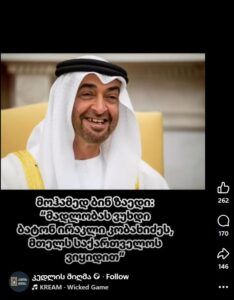 სოციალურ ქსელში Facebook-მომხმარებელი ავრცელებს პოსტს (დაარქივებული ბმული), რომელშიც თითქოს არაბთა გაერთიანებული საამიროების პრეზიდენტის შეიხ მუჰამად ბინ ზაიდის ციტატაა მოცემული: „მთელ საქართველოს ვიყიდით“. სინამდვილეში, ციტატა ყალბია და ამგვარი განცხადება არც ერთ სანდო მედიასა თუ ღია წყაროში არ გავრცელებულა.