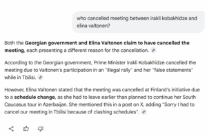 რადგან სოციალურ ქსელში გავრცელებულ პოსტში Google-ის ხელოვნური ინტელექტის პასუხიცაა მოცემული, „ჯეოფაქტსმა“ ვალტონენსა და კობახიძეს შორის შეხვედრის გაუქმებაზე კითხვა დაუსვა. Google-ის ხელოვნურმა ინტელექტმა შემდეგი პასუხი გაგვცა: “როგორც საქართველოს მთავრობა, ისე ელინა ვალტონენიც აცხადებენ, რომ შეხვედრა გაუქმდა, თუმცა ორივე მხარე განსხვავებულ მიზეზს ასახელებს.
