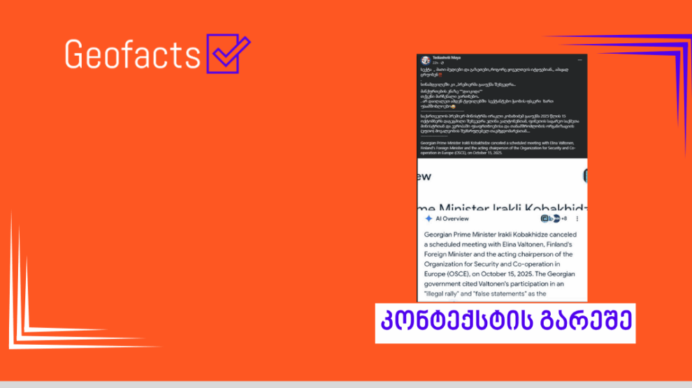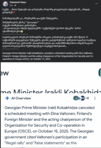 სოციალურ ქსელში Facebook ანგარიში, რომლის მიერ გავრცელებული დეზინფორმაცია „ჯეოფაქტსს“ წარსულშიც გადაუმოწმებია, წერს, რომ ქართული მედიები იტყუებიან და რეალურად 2025 წლის 15 ოქტომბერს ფინეთის საგარეო საქმეთა მინისტრსა და ეუთოს მოქმედ თავმჯდომარეს, ელინა ვალტონენსა და ირაკლი კობახიძეს შორის დაგეგმილი შეხვედრა კობახიძემ გააუქმა. ამის დასადასტურებლად პოსტს თან ერთვის ფოტოსურათი, რომელშიც Google-ის ხელოვნური ინტელექტის პასუხია მოცემული: „საქართველოს პრემიერ-მინისტრმა ირაკლი კობახიძემ გააუქმა 2025 წლის 15 ოქტომბერს დაგეგმილი შეხვედრა ელინა ვალტონენთან, ფინეთის საგარეო საქმეთა მინისტრთან და ევროპაში უსაფრთხოებისა და თანამშრომლობის ორგანიზაციის (ეუთო) მოვალეობის შემსრულებელ თავმჯდომარესთან“. ამასთან, პოსტში არ ჩანს ზუსტი კითხვა, რაც ხელოვნურ ინტელექტს დაუსვეს. (არქივირებული ბმული)
