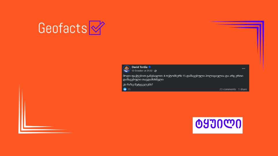 სოციალურ ქსელში Facebook-მომხმარებელი Davit Tordia, რომლის მიერ გავრცელებული დეზინფორმაცია „ჯეოფაქტსს“ წარსულშიც გადაუმოწმებია (1, 2, 3, 4), ავრცელებს პოსტს (დაარქივებული ბმული): „მოდი ფაქტებით განვსაჯოთ: 4 ოქტომბერს 15 დაშავებული პოლიციელია და არც ერთი დაშავებული თავდამსხმელი. ეს რაზე მეტყველებს?“. სინამდვილეში, ჯანდაცვის სამინისტროს ინფორმაციით, 4 ოქტომბერს დაშავებულთა შორის იყვნენ როგორც პოლიციელები, ისე პროტესტის მონაწილეები.