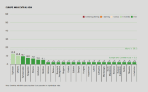 ევროპისა და ცენტრალური აზიის რეგიონის ქვეყნებში შიმშილის დონე უმეტეს შემთხვევაში, საქართველოს მსგავსად, დაბალია (იხილეთ ქვემოთ მოცემული გრაფიკი).