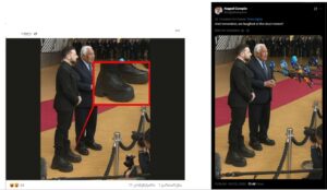 სოციალურ ქსელში Facebook-ანგარიში ფოტოს აქვეყნებს, რომელზეც უკრაინის პრეზიდენტ ზელენსკის დიდი ზომის ფეხსაცმელი აცვია (დაარქივებული ბმული). აღნიშნული ფოტოს სავარაუდო პირველწყარო რუსულენოვანი X-ანგარიშია. სინამდვილეში, ფოტო ხელოვნური ინტელექტის მიერ არის გენერირებული.