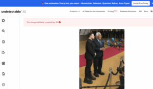 ხელოვნური ინტელექტის ამომცნობი ხელსაწყოს Undetectable.ai-ის მიხედვით, ფოტო 97%-იანი ალბათობით შეიცავს ხელოვნური ინტელექტის კვალს. კიდევ ერთი ხელსაწყოს Hive Moderation-ის მიხედვით კი, ფოტო 98.9%-იანი ალბათობით შეიცავს ხელოვნური ინტელექტის ან Deepfake-ის კვალს.
