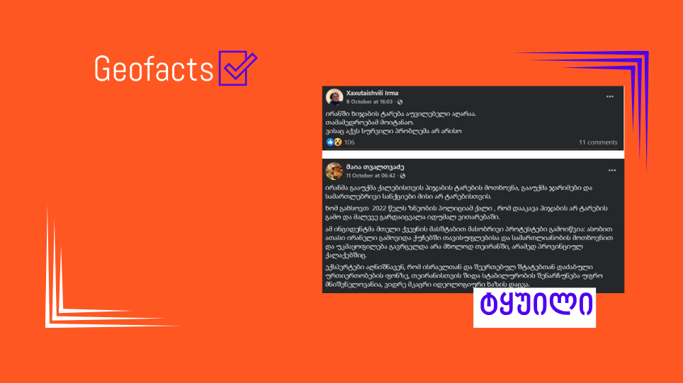 სოციალურ ქსელში Facebook-მომხმარებლები ავრცელებენ პოსტებს (1, 2, 3), რომელთა მიხედვით, ირანში ჰიჯაბის ტარება სავალდებულო აღარაა: „ირანმა გააუქმა ქალებისთვის ჰიჯაბის ტარების მოთხოვნა, გააუქმა ჯარიმები და სამართლებრივი სანქციები მისი არ ტარებისთვის…“; ირანში ხიჯაბის ტარება აუცილებელი აღარაა. თანამედროვეობამ მოიტანაო. ვისაც აქვს სურვილი პრობლემა არ არისო“. სინამდვილეში, მტკიცებები ყალბია და ირანის კანონში მსგავს ცვლილებას ადგილი არ ჰქონია.