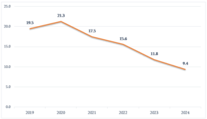 გრაფიკი 1: სიღარიბის აბსოლუტურ ზღვარს ქვემოთ მყოფი მოსახლეობის წილი  (%)