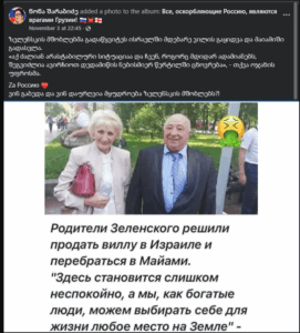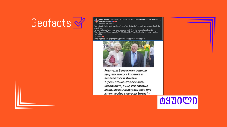 სოციალურ ქსელში Facebook-ანგარიში „ნონა შარაბიძე“, რომლის მიერ გავრცელებული დეზინფორმაცია „ჯეოფაქტსს” არაერთხელ გადაუმოწმებია (1; 2; 3), ფოტოს ავრცელებს, რომელზეც უკრაინის პრეზიდენტის მშობლები ჩანან, ქვემოთ კი რუსული ტექსტია მოცემული. ფოტოს აღწერაში ტექსტი ქართულადაა თარგმნილი და ვკითხულობთ: „ზელენსკის მშობლებმა გადაწყვიტეს ისრაელში მდებარე ვილის გაყიდვა და მაიამიში გადასვლა.