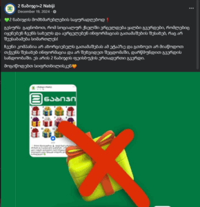 სოციალურ ქსელში Facebook-გვერდი 2 ნაბიჯი• 2 Nabiji თაღლითურ პოსტს ავრცელებს. პოსტის აღწერის თანახმად, სუპერმარკეტის დაბადების დღის აღსანიშნავად, მომხმარებლებს ექსკლუზიურ საჩუქრებს გადასცემენ: „გამარჯობა ყველას! @2 ნაბიჯი•2 Nabiji-ის 2025 წლის დაბადების დღის აღსანიშნავად, ყველა, ვინც 15 ნოემბრამდე ჩვენს გვერდზე დაწერს “გილოცავ დაბადების დღეს”, მიიღებს ექსკლუზიურ სასაჩუქრე ჩანთას, ნაღდ ფულს და ვაუჩერებს. წარმატებებს გისურვებთ!“, – ვკითხულობთ პოსტში. რეალურად, პოსტი სუპერმარკეტების ქსელ „ორ ნაბიჯს“ არ ეკუთვნის და სავარაუდოდ, თაღლითური სქემის ნაწილია (არქივირებული ბმული).