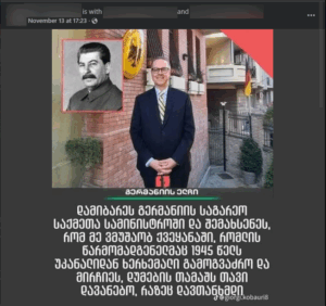 სოციალურ ქსელში Facebook-მომხმარებელი ფოტოს ავრცელებს, რომელზეც გერმანიის ელჩი საქართველოში, პეტერ ფიშერი ჩანს, ქვემოთ კი შემდეგი ტექსტი გვხვდება, რომელიც ფიშერის ციტატადაა წარმოჩენილი: „დამიბარეს გერმანიის საგარეო საქმეთა სამინისტროში და შემახსენეს, რომ მე ვმუშაობ ქვეყანაში, რომლის წარმომადგენელმაც 1945 წელს უკანალიდან ხერხემალი გამოგვაძრო და მირჩიეს, დუმების თამაშს თავი დავანებო, რაზეც დავთანხმდი“. (არქივირებული ბმული)