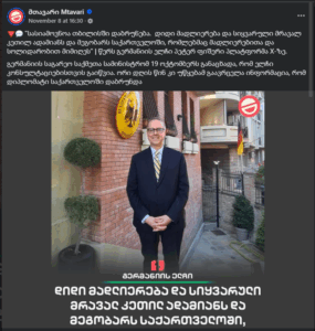 პეტერ ფიშერის იდენტური ფოტოთი ბოლო პოსტი „მთავარის“ გვერდზე 2025 წლის 8 ნოემბერსაა გამოქვეყნებული, რომელშიც ვკითხულობთ: „”სასიამოვნოა თბილისში დაბრუნება. დიდი მადლიერება და სიყვარული მრავალ კეთილ ადამიანს და მეგობარს საქართველოში, რომლებმაც მადლიერებითა და სოლიდარობით მიმიღეს”, – წერს გერმანიის ელჩი პეტერ ფიშერი პლატფორმა X-ზე.