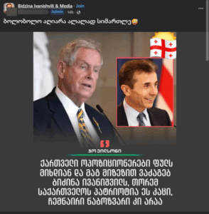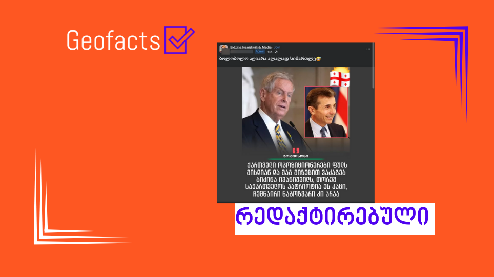 Facebook-ჯგუფში Bidzina Ivanishvili & Media საინფორმაციო ბარათი ვრცელდება, რომელზეც ამერიკელი კონგრესმენი ჯო უილსონი და „ქართული ოცნების“ საპატიო თავმჯდომარე ბიძინა ივანიშვილი ჩანან. ბარათზე ვკითხულობთ შემდეგ ტექსტს, რომელიც ჯო უილსონის ციტატადაა წარმოჩენილი: „ქართველი ოპოზიციონერები ფულს მიხდიან და მაგ მიზეზით ვაძაგებ ბიძინა ივანიშვილს, თორემ საქართველოს პატრიოტია ეს კაცი, ჩემნაირი ნაბო**არი კი არაა.“ Facebook-მომხმარებელი პოსტს შემდეგნაირად ასათაურებს: „ბოლობოლო აღიარა ალალად სიმართლე“ (არქივირებული ბმული)