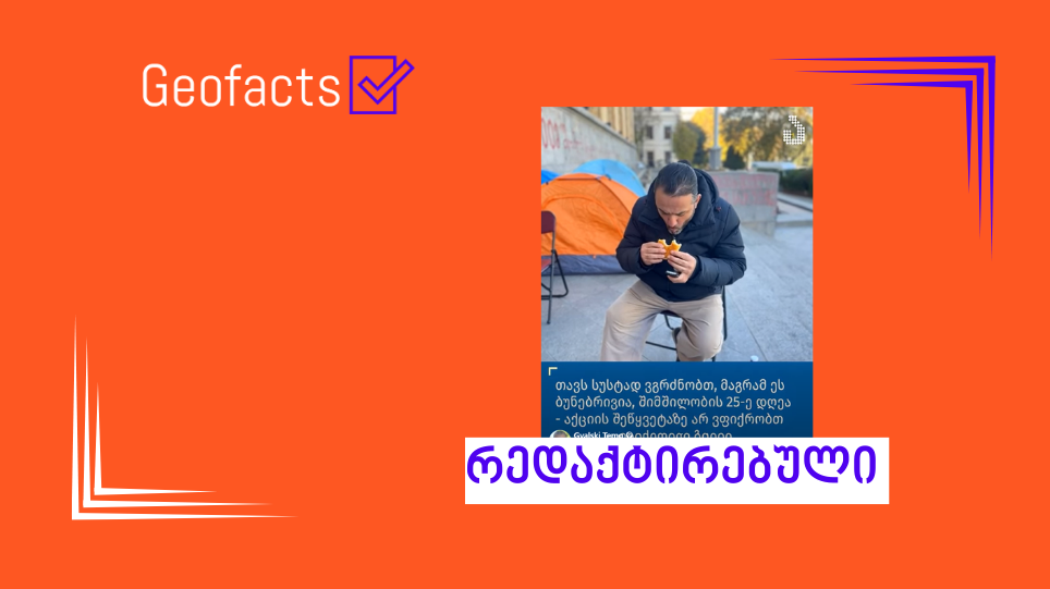 სოციალურ ქსელში Facebook-მომხმარებელი Gvalski Temo, რომლის მიერ გავრცელებული დეზინფორმაცია „ჯეოფაქტსს“ წარსულშიც გადაუმოწმებია (1, 2, 3), „კოალიცია ცვლილებებისთვის“ ერთ-ერთი ლიდერის, გედევან ფოფხაძის ვიდეოს (დაარქივებული ბმული) ავრცელებს, რომელშიც ის საკვებს (სავარაუდოდ, ღვეზელს) იღებს. ვიდეოს თან ახლავს წარწერა: „თავს სუსტად ვგრძნობთ, მაგრამ ეს ბუნებრივია, შიმშილობის 25-ე დღეა – აქციის შეწყვეტაზე არ ვფიქრობთ“. ვიდეოს მარჯვენა ზედა კუთხეში თან ახლავს ლოგო „ა“. რეალურად, ვიდეო ყალბია და ხელოვნური ინტელექტის მიერაა შექმნილი.