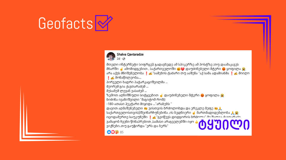 სოციალურ ქსელში Facebook-მომხმარებელი Shalva Qavtaradze, რომლის მიერ გავრცელებული დეზინფორმაცია „ჯეოფაქტსს“ წარსულშიც გადაუმოწმებია (1, 2, 3, 4), ამტკიცებს, რომ ბიძინა ივანიშვილმა არაბებს 180 000 ჰექტარი მიჰყიდა. ავტორი, სავარაუდოდ, Eagle Hills-ის პროექტს გულისხმობს, რომელზეც საჯაროდ გავრცელებული ინფორმაციის თანახმად, თბილისსა და გონიოში არა 180 000, არამედ მასზე 212-ჯერ ნაკლები – 850 ჰექტარია გამოყოფილი და სადაც სახელმწიფო თანამესაკუთრედ რჩება (არქივირებული ბმული).