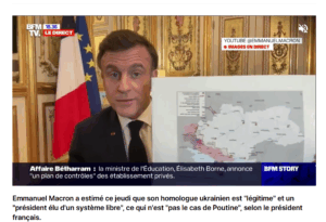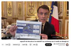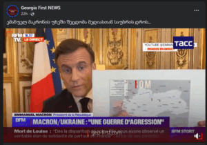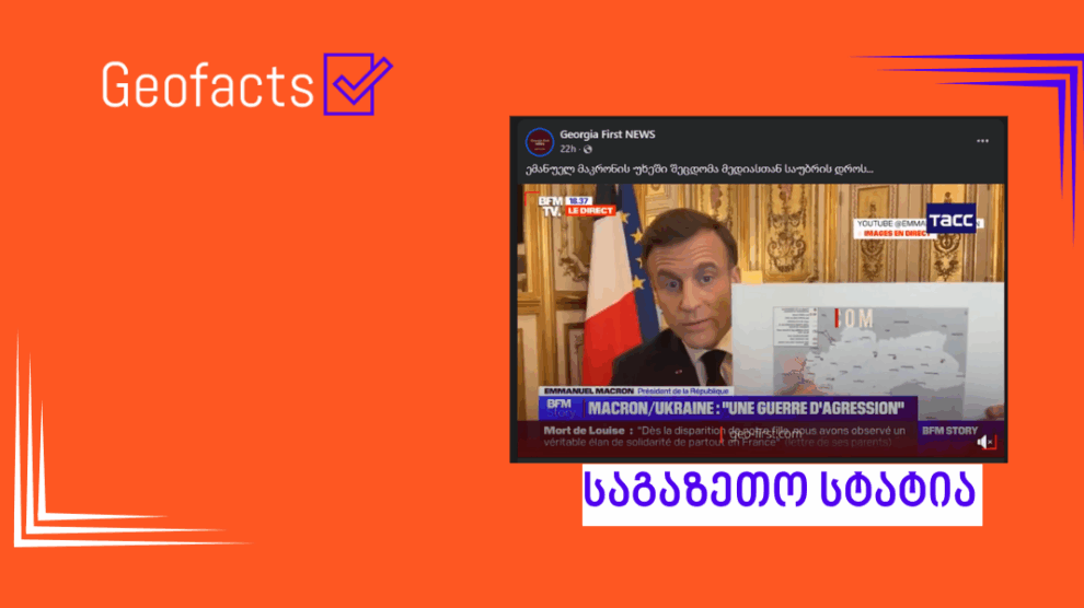 სოციალურ ქსელში Facebook-გვერდი Georgia First News, რომლის მიერ გავრცელებული დეზინფორმაცია „ჯეოფაქტსს“ წარსულშიც გადაუმოწმებია (1; 2; 3) საფრანგეთის პრეზიდენტის, ემანუელ მაკრონის ვიდეოს ავრცელებს შემდეგი აღწერით: „ემანუელ მაკრონის უხეში შეცდომა მედიასთან საუბრის დროს…“. ვიდეოში მთხრობელი ამბობს: „საფრანგეთის პრეზიდენტის, ემანუელ მაკრონს მედიასთან საუბრის დროს უკრაინის რუკა თავდაყირა ეჭირა და ასეთ მდგომარეობაში ცდილობდა უკრაინაში არსებული ვითარების ახსნას“. სინამდვილეში, გავრცელებული ინფორმაცია შეცდომაში შემყვანია. რეალურად, ვიდეო სარკის ეფექტითაა გადაღებული, სწორედ ამიტომ ჩანს შებრუნებული ვერსია. (არქივირებული ბმული)