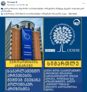 2025 წლის 5 ნოემბერს ტელეკომპანია „იმედმა“ საკუთარ Facebook-გვერდზე გამოაქვეყნა ფოტო-პოსტი. ფოტო-პოსტის მარცხენა მხარეს მოყვანილია ციტატა ევროკომისიის 2025 წლის გაფართოების ანგარიშიდან, სადაც წერია, რომ არჩევნების შემდეგ „საქართველო ღრმა პოლიტიკურ კრიზისში შევიდა“, ხოლო მის საპასუხოდ, მარჯვენა მხარეს, არის წარწერა 2024 წლის საპარლამენტო არჩევნების შესახებ ეუთო/ოდირის საბოლოო ანგარიშზე: „2024 წლის საპარლამენტო არჩევნები მთავარმა სადამკვირვებლო მისიამ აღიარა, როდესაც მას კონკურენტული, ხოლო „ქართულ ოცნებას“ არჩეული ხელისუფლება უწოდა“ (არქივირებული ბმული).