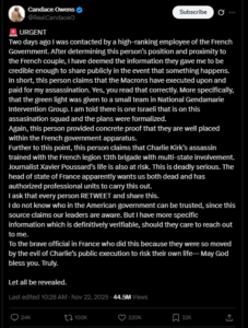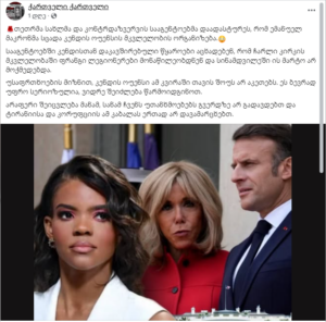 სოციალურ ქსელში Facebook-ანგარიში „ქართველი ქართველი“, რომლის მიერ გავრცელებულ დეზინფორმაციაზე „ჯეოფაქტს“ აქამდეც დაუწერია (1; 2), პოსტს აქვეყნებს (დაარქივებული ბმული). პოსტის მიხედვით, აშშ-ის თეთრმა სახლმა დაადასტურა, რომ საფრანგეთის პრეზიდენტმა მაკრონმა სცადა ამერიკელი ულტრამემარჯვენე ინფლუენსერის კენდის ოუენსის მკვლელობის ორგანიზება: „თეთრმა სახლმა და კონტრდაზვერვის სააგენტოებმა დაადასტურეს, რომ ემანუელ მაკრონმა სცადა კენდის ოუენსის მკვლელობის ორგანიზება. სააგენტოებში კენდისთან დაკავშირებული წყაროები აცხადებენ, რომ ჩარლი კირკის მკვლელობაში ფრანგი ლეგიონერები მონაწილეობდნენ და სინამდვილეში ის მარტო არ მოქმედებდა. უსაფრთხოების მიზნით, კენდის ოუენსი ამ კვირაში თავის შოუს არ აკეთებს. ეს ბევრად უფრო სერიოზულია, ვიდრე შეიძლება წარმოიდგინოთ“, – ვკითხულობთ პოსტის აღწერაში.